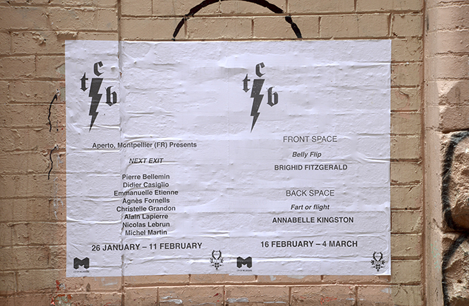 In 2016, the TCB board members exhibited at Aperto gallery in Montpellier as part of its on going exchange with artist run spaces internationally. In exchange, tcb art Inc. is proud to showcase Next Exit, an exhibition by Aperto Collective from Aperto Gallery, in Melbourne.