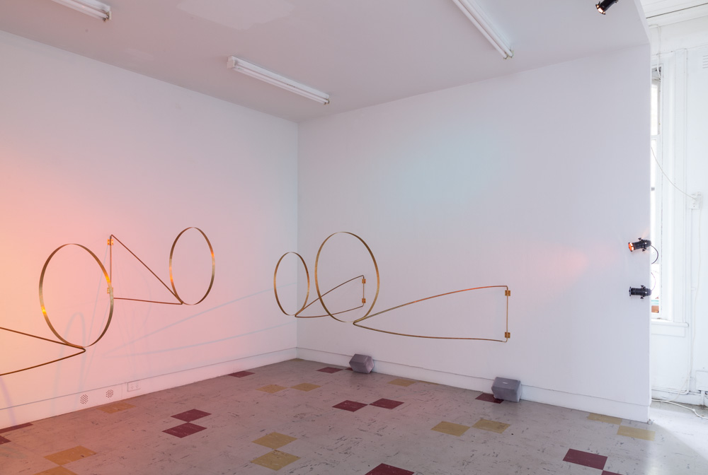 Anna Varendorff and Haima Marriott have orchestrated a place of interaction. In a space spilling with coloured light, Varendorff’s brass structures offer up the opportunity to interact. They begin to murmur as one approaches and as you get closer Marriott’s sound work seeps out into the space, crescendoing upon touch. Immersive, the work offers sound and shadow as a demarcation of the activity of the visitor. The latency of the room is established to offer change when a body enters it and interacts with the work. It is a space of opportunity.